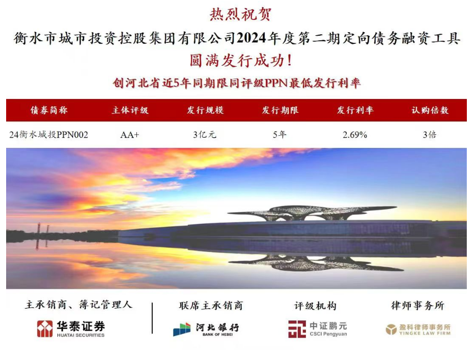 6月26日,市城投集團2024年度第二期定向債務融資工具(PPN)發行工作圓滿完成。本期債券募集資金3億元人民幣,期限為5年,利率為2.69%,認購倍數高達3倍,這一成績不僅彰顯了市場對集團信用和發展前景的高度認可,也創下了河北省近5年同期限同評級PPN的最低發行利率。